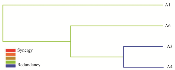 最佳模型树状图。距离越近的位点,交互作用越强。连线颜色为红色,位点间的交互作用越接近协同作用,若连线颜色越浅,则表示交互作用较弱